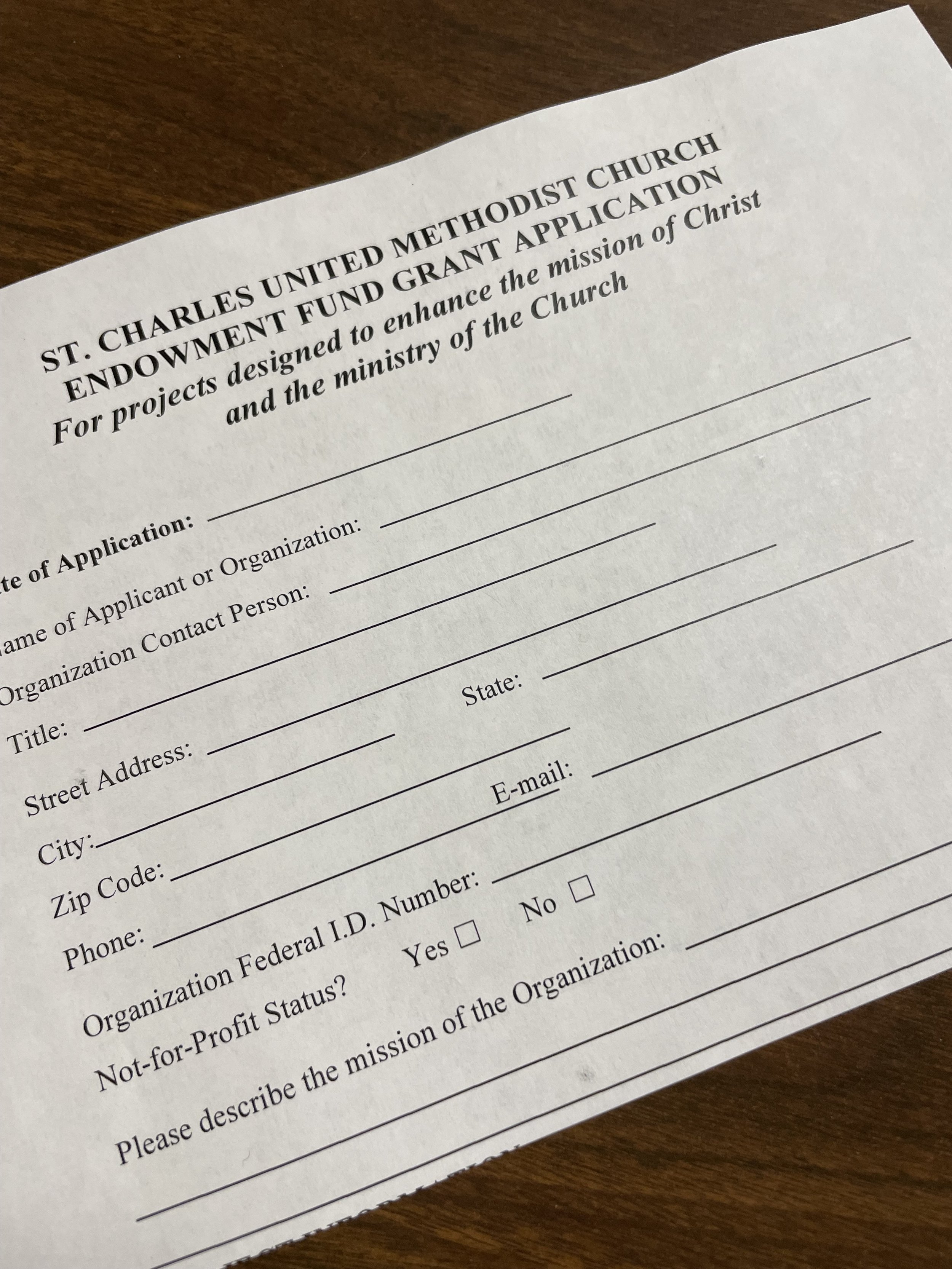 2026 Endowment Grant Applications are available on the St. Charles United Methodist Church website of: stcharlesumc.net with a deadline of April 30, 2026.